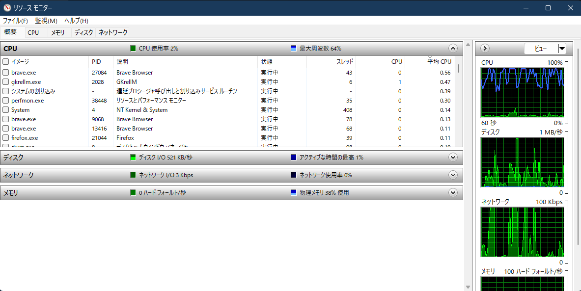 PCが唸りだしたら、モニターを表示させてリソースモニターを確認する。