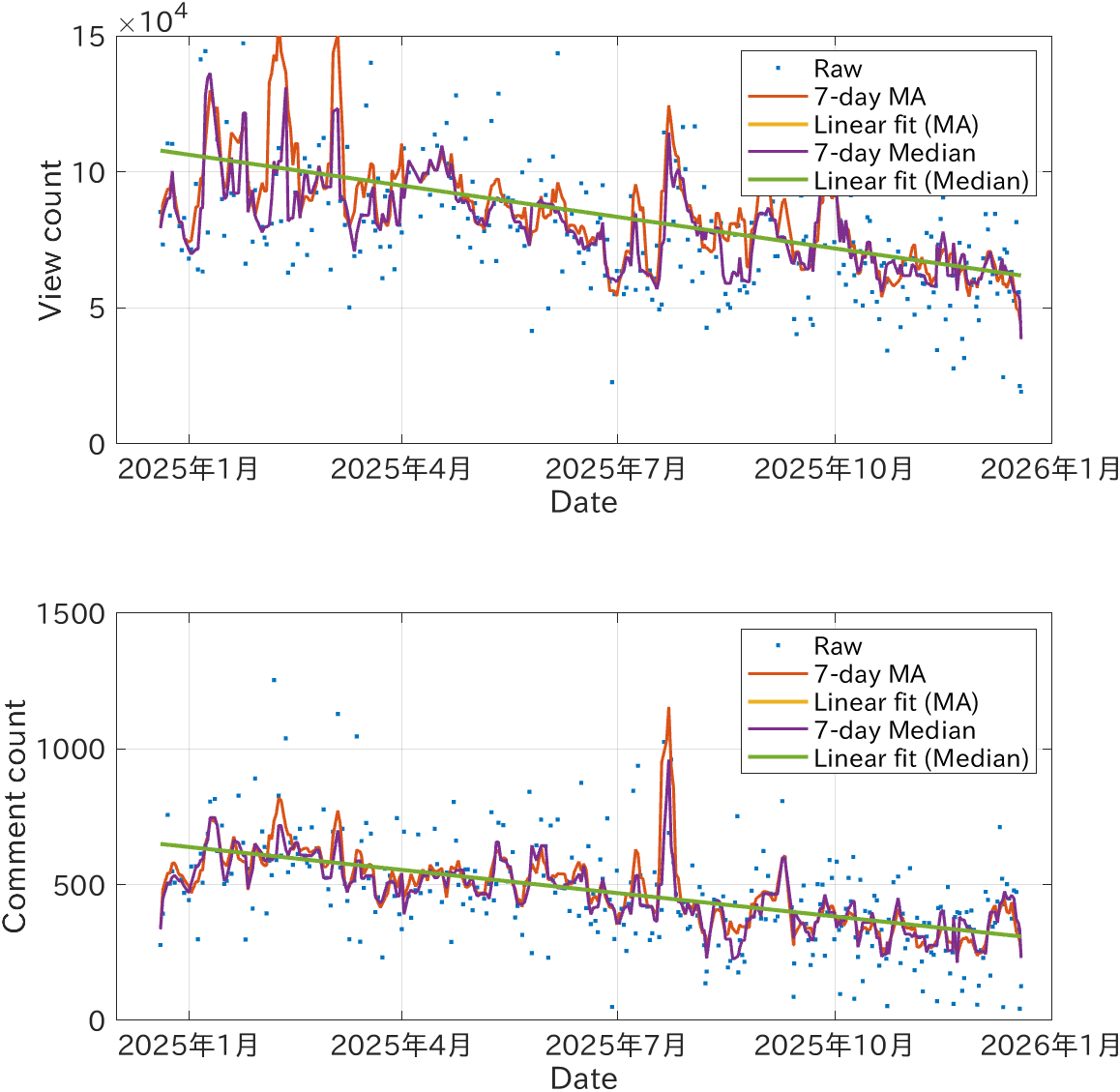 ただ全体的には右肩下がりで、再生数・コメント数とも徐々に減少していることは一目瞭然である。 非常に大雑把に言って、1年で再生数は約35〜40%減、コメント数は約45〜50%減 (ほぼ半減)である。