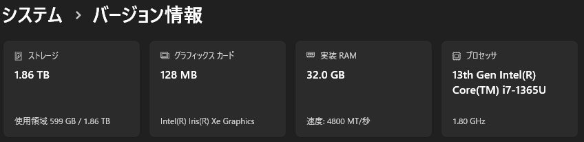会社PCのシステム情報はこんな感じ:グラフィックはIntel Iris Xe Graphicsである。